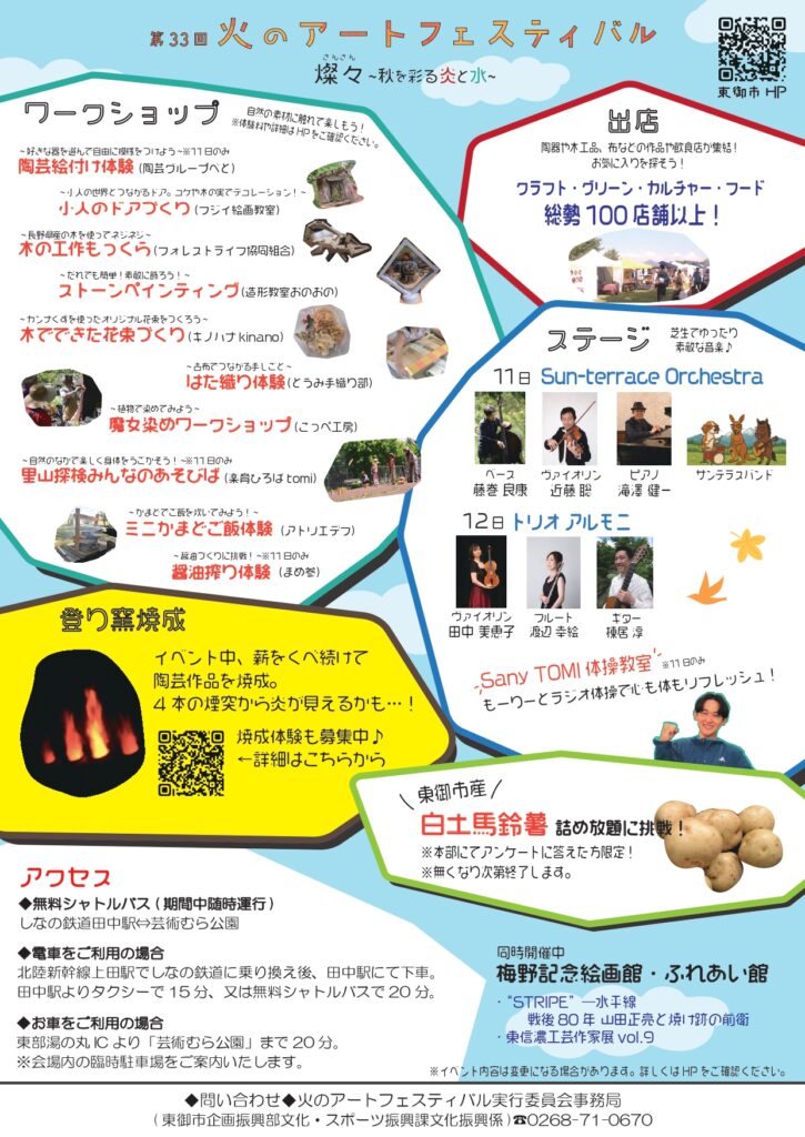 東御市が開催する「火のアートフェスティバル」に参加します。私たちは、八重原産の酒米で仕込んだ日本酒をはじめ、日本酒によく合うおつまみもご用意。さらに、この時期ならではの採れたて新米コシヒカリも持っていきます。日本酒やお米の魅力を存分に楽しんでいただける内容です。また、厳選ワインもお持ちしますので、日本酒好きの方もワイン好きの方もぜひ足をお運びください。(状況により出展内容が変更になる場合がございます)